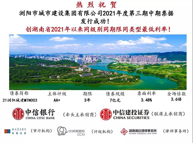 8月5日,瀏發(fā)集團子公司瀏陽城建集團2021年度第三期中期票據(jù)成功發(fā)行,發(fā)行規(guī)模7億元,期限3年,票面利率為3.48%,創(chuàng)湖南省2021年以來同級別、同期限、同類型最低利率!