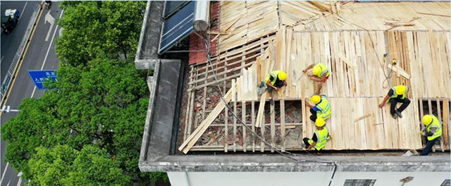 屋頂上的溫度比地面高出七八攝氏度。鄧康戴著安全帽,踩在木架上,大滴汗水直往下流。鄧康用手肘一蹭,繼續(xù)工作。鄧康介紹,從6月22日以來,他幾乎每天都在工地上,“改造好瀏陽一中宿舍的幾棟老房子的屋頂后,我又去了思邈公寓、環(huán)衛(wèi)局宿舍工地,現(xiàn)在財富大廈的屋頂改造工作也快結(jié)束了?!?/p>