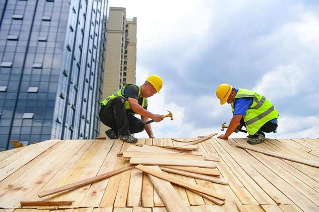 在財富大廈施工現(xiàn)場,已經(jīng)從事建筑行業(yè)多年的鄧康,正和工友們在8樓高的頂樓進(jìn)行屋頂改造施工。這處施工面積有600余平方米的屋頂上,老舊瓦片已經(jīng)被去除,工人們正在忙碌,“這幾天天氣好,沒有下雨,我們要趕緊把架子搭好,鋪上油毛氈,釘上順?biāo)畻l、掛瓦條,把樹脂瓦鋪上去?!?/p>