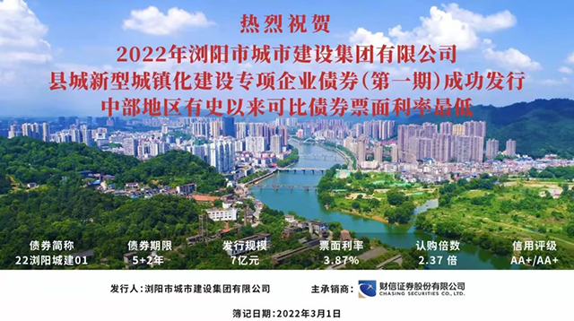 3月1日,瀏發(fā)集團(tuán)子公司瀏陽城建集團(tuán)2022年縣城新型城鎮(zhèn)化建設(shè)專項(xiàng)企業(yè)債券(第一期)成功發(fā)行,發(fā)行規(guī)模7億元,期限5+2年,發(fā)行利率3.87%,創(chuàng)中部地區(qū)有史以來可比債券最低利率。