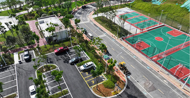 綠茵茵的草坪、嶄新的球架……沿著入口前行,首先映入眼簾的是一片全新建成的運(yùn)動(dòng)場(chǎng)地——景觀帶配備了1個(gè)七人制足球場(chǎng)、2個(gè)籃球場(chǎng)和3個(gè)羽毛球場(chǎng),豐富的體育設(shè)施可滿足市民的多元化運(yùn)動(dòng)需求。