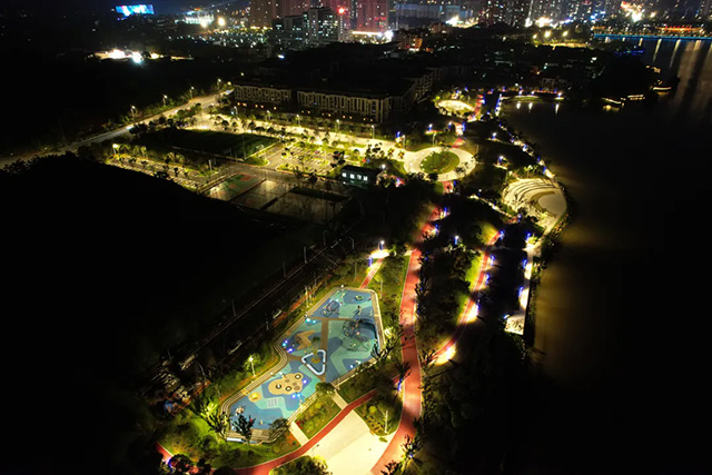 五環(huán)廣場(chǎng)開闊平坦,地面鋪設(shè)著色彩鮮艷的圖案,是一方休憩活動(dòng)的絕佳空間;濱水舞臺(tái)廣場(chǎng)緊鄰湖畔,未來這里還將打造成城市煙花燃放點(diǎn);兒童活動(dòng)廣場(chǎng)上,蹦蹦床、秋千、攀爬網(wǎng)、搖搖椅、涂鴉墻、塑膠跑道、輪轉(zhuǎn)椅等設(shè)施一應(yīng)俱全。隨著夜幕降臨,景觀帶特別安裝的二十多盞投影燈開啟,6種圖案投射在地面上不斷變幻,為夜晚的廣場(chǎng)增添了夢(mèng)幻色彩。
