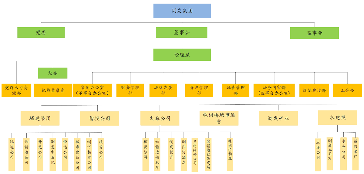瀏陽(yáng)市城鄉(xiāng)發(fā)展集團(tuán)有限責(zé)任公司(簡(jiǎn)稱(chēng)“瀏發(fā)集團(tuán)”)成立于2020年3月,2020年5月18日正式掛牌運(yùn)營(yíng),是瀏陽(yáng)市委、市政府組建的國(guó)有獨(dú)資企業(yè)。公司注冊(cè)資金100億元,現(xiàn)有總資產(chǎn)1100億元+,信用等級(jí)AAA+,是以瀏陽(yáng)市城市建設(shè)集團(tuán)有限公司、市水利建設(shè)投資有限公司、市文化旅游產(chǎn)業(yè)發(fā)展有限責(zé)任公司為主體組建的市屬投資管理類(lèi)企業(yè)集團(tuán)。 公司按照“政府引導(dǎo),市場(chǎng)運(yùn)作”的原則,深耕城市運(yùn)營(yíng)、城市建設(shè)、文旅投資、產(chǎn)業(yè)投資、鄉(xiāng)村振興等五大業(yè)務(wù)板塊。公司下屬二級(jí)公司6個(gè)(城建集團(tuán)、水建投、文旅公司、瀏發(fā)礦業(yè)、株樹(shù)橋城市運(yùn)營(yíng)(管理物業(yè)公司)、智投公司);全資三級(jí)公司16個(gè)(鴻達(dá)公司、湘贛邊公司、恒遠(yuǎn)公司、城市更新公司、瀏河拍賣(mài)公司、扶貧公司、榴花旅游、瀏發(fā)教育、瀏陽(yáng)河酒店、鄉(xiāng)村振興公司、紅源實(shí)業(yè)、五環(huán)公司、水務(wù)公司(管理第四水廠(chǎng))、瀏金渣土、瀏金土石方);控股三級(jí)公司3個(gè)(開(kāi)元公司(管理瀏發(fā)中石化)、湘贛邊候機(jī)廳)。