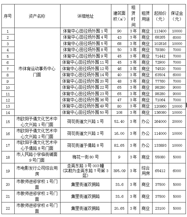 受瀏陽市體育運動事務(wù)中心、瀏陽市歐陽予倩文化藝術(shù)中心等單位委托,根據(jù)國有資產(chǎn)管理的相關(guān)規(guī)定,我公司定于2021年1月13日上午10:00在瀏陽市城鄉(xiāng)發(fā)展集團有限責(zé)任公司8樓會議室,對位于瀏陽市荷花街道文興路與予倩路、梅花一街80號等22處資產(chǎn)面向社會進行公開拍租,標的情況見下表: