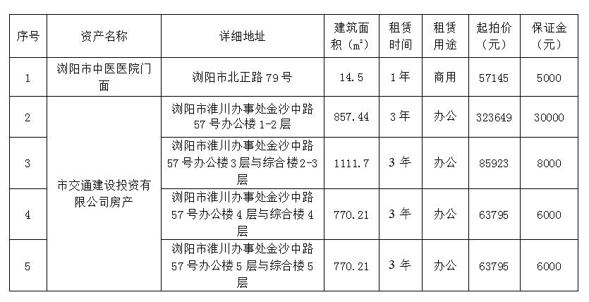 受瀏陽市中醫(yī)醫(yī)院和瀏陽市交通建設(shè)投資有限公司等單位委托,根據(jù)國有資產(chǎn)管理的相關(guān)規(guī)定,我公司定于2021年1月28日下午14:00在瀏陽市城鄉(xiāng)發(fā)展集團(tuán)有限責(zé)任公司8樓會議室,對位于瀏陽市北正路、金沙中路57號等5處資產(chǎn)面向社會進(jìn)行公開拍租。