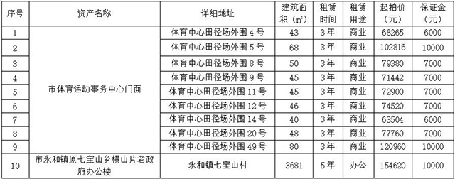 受瀏陽市體育運(yùn)動(dòng)事務(wù)中心和瀏陽市永和鎮(zhèn)人民政府等單位委托,根據(jù)國有資產(chǎn)管理的相關(guān)規(guī)定,我公司定于2021年3月10日上午10:00在瀏陽市城鄉(xiāng)發(fā)展集團(tuán)有限責(zé)任公司8樓會(huì)議室,對(duì)位于瀏陽市體育中心田徑場(chǎng)外圍和永和鎮(zhèn)七寶山村等資產(chǎn)面向社會(huì)進(jìn)行公開拍租。標(biāo)的情況見下表: