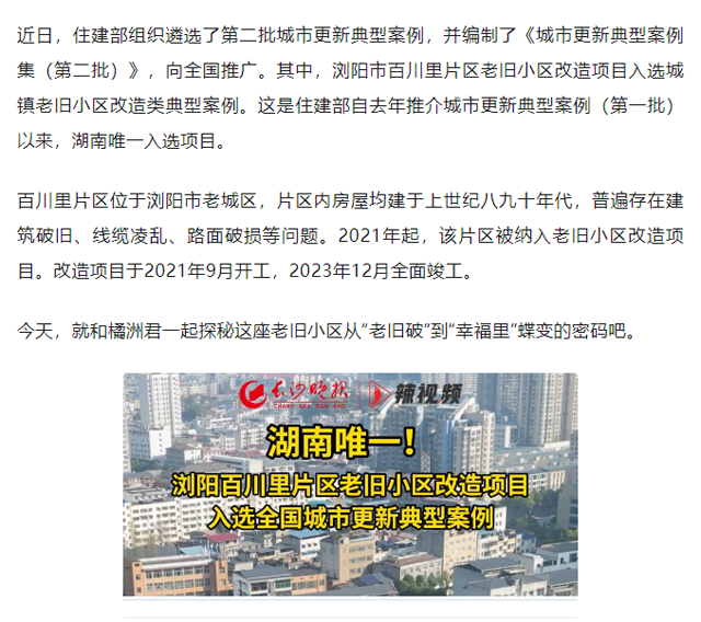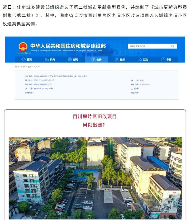 近日,住房城鄉(xiāng)建設(shè)部印發(fā)城市更新典型案例(第二批),瀏陽百川里片區(qū)老舊小區(qū)改造項(xiàng)目成功入選,成為湖南唯一,這是繼2023年榮獲“中國(guó)人居環(huán)境范例獎(jiǎng)”之后,再一次榮獲國(guó)家級(jí)的榮譽(yù)。