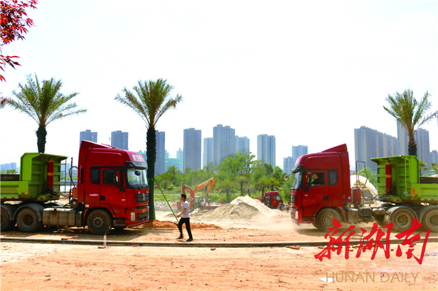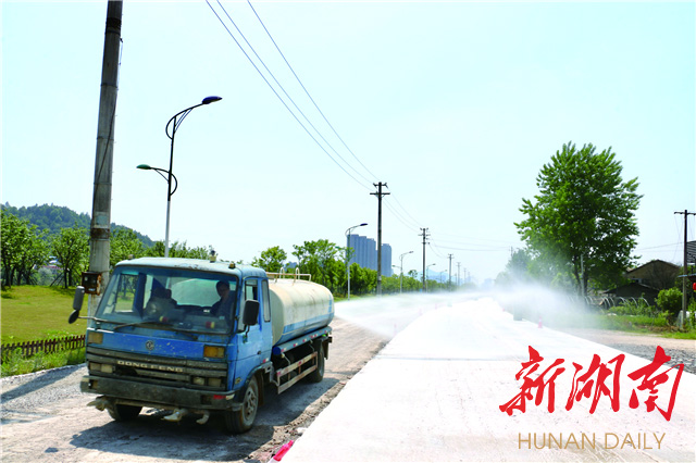 (瀏陽河?xùn)|路施工現(xiàn)場,灑水車正在為施工路面灑水。)