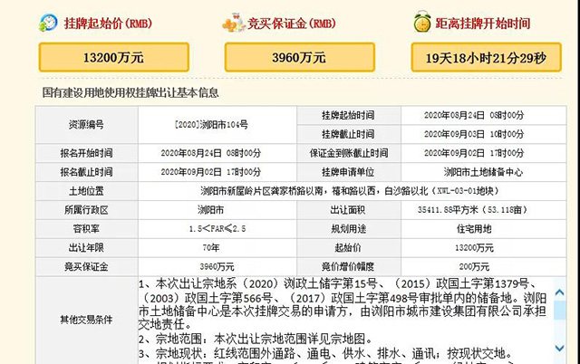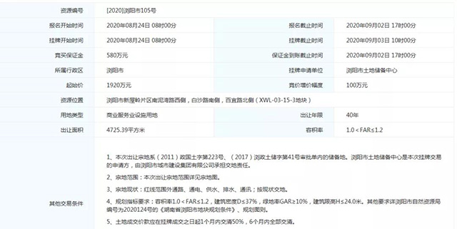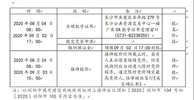 根據(jù)國土資源相關(guān)法律規(guī)定,并經(jīng)瀏陽市人民政府批準(zhǔn),瀏陽市新屋嶺片區(qū)XWL-03-01、XWL-03-15-3號兩宗地塊以網(wǎng)上掛牌方式進(jìn)行公開出讓,有意競買者可于2020年8月4日至2020年9月3日登錄“長沙市國土資源網(wǎng)上交易系統(tǒng)(http://gtzy.csggzy.cn)”進(jìn)行查詢,資源編號分別為〔2020〕瀏陽市104號和〔2020〕瀏陽市105號。