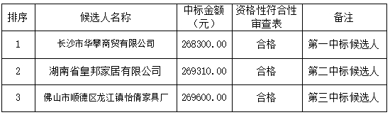 受瀏陽市水利建設投資有限公司的委托,湖南凱博項目管理有限公司對瀏陽市集里街道集里中學至善公租房項目家具采購進行公開招標采購,現(xiàn)將采購結(jié)果公告如下: