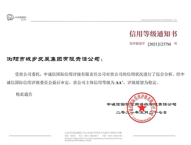 5月31日,經(jīng)國內(nèi)權(quán)威信用評級機構(gòu)中誠信國際評定,瀏發(fā)集團獲評主體信用等級“AA+”,評級展望為“穩(wěn)定”,實現(xiàn)了瀏陽國有企業(yè)在信用評級上的又一重大突破,具有里程碑意義。