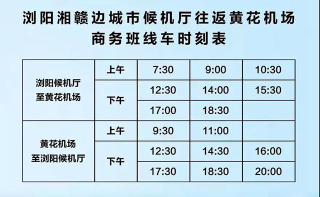 自2021年11月26日起,瀏陽湘贛邊城市候機廳至黃花國際機場往返客運班線恢復(fù)運營,具體班次如下:
