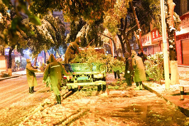 瀏發(fā)集團(tuán)組織5臺(tái)鏟車、4臺(tái)貨運(yùn)車,20余名應(yīng)急救援隊(duì)員迎戰(zhàn)風(fēng)雪,撒鹽、鏟雪、砍斷被折樹枝并及時(shí)清理拖運(yùn)……經(jīng)過4個(gè)多小時(shí)的奮戰(zhàn),才確保了勞動(dòng)路、翠園路、圭齋路等道路的暢通。