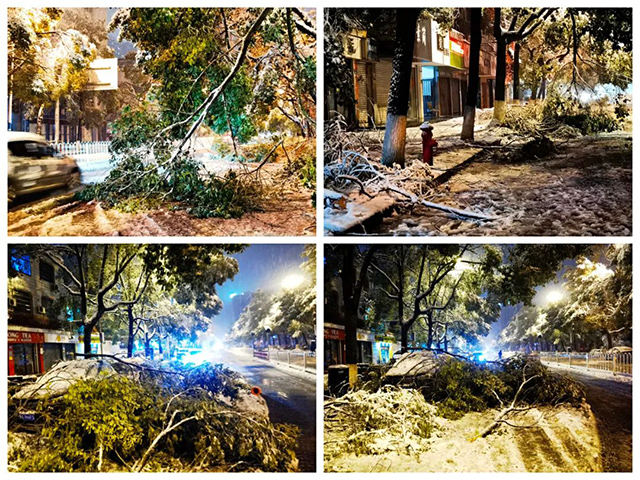 當(dāng)晚,漫天飛雪一直沒有停歇,勞動(dòng)路、翠園路口積雪嚴(yán)重,路邊行道樹被積雪壓彎,部分樹枝墜落砸到車輛,影響行車安全。