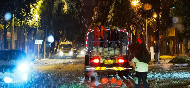 晚上8點(diǎn),瀏發(fā)集團(tuán)應(yīng)急救援隊(duì)聞令出動(dòng),緊急迎戰(zhàn),針對(duì)勞動(dòng)路、翠園路、圭齋路等積雪嚴(yán)重路段,以及公共停車場(chǎng)展開除雪防滑保暢通行動(dòng)。