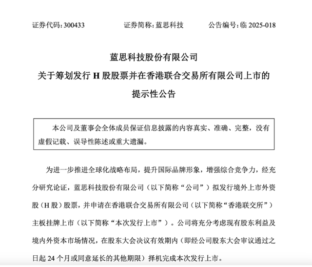 日前,藍(lán)思科技發(fā)布公告稱,公司已于2025年3月31日向香港聯(lián)合交易所有限公司遞交了發(fā)行境外上市外資股(H股)股票并在香港聯(lián)交所主板掛牌上市的申請(qǐng),并于同日在香港聯(lián)交所網(wǎng)站刊登了本次發(fā)行的申請(qǐng)資料。