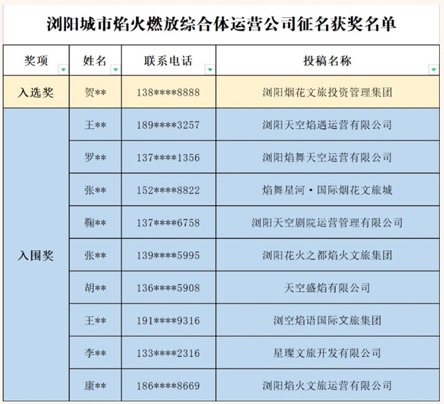 3月中旬,瀏陽城市焰火燃放綜合體運營公司全球征集命名活動啟動,引發(fā)高度關(guān)注。經(jīng)過綜合評審、復(fù)選與終選,最終確定了“入圍獎”作品10件,其中由“賀**”提交的“瀏陽煙花文旅投資管理集團(tuán)”評為“入選獎”。具體名單如下: