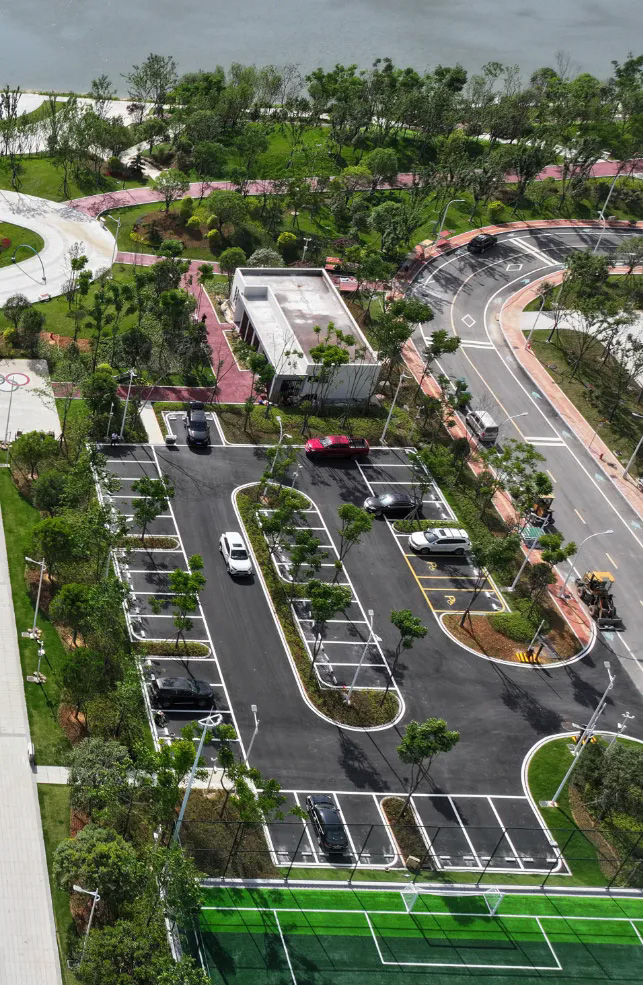 平整的柏油路上,車位整齊劃一;非機(jī)動車停車位上方,避雨的頂棚設(shè)計精巧實用;微型消防站、高清監(jiān)控等安全設(shè)施齊全,共同構(gòu)筑起安全便捷的停車環(huán)境。