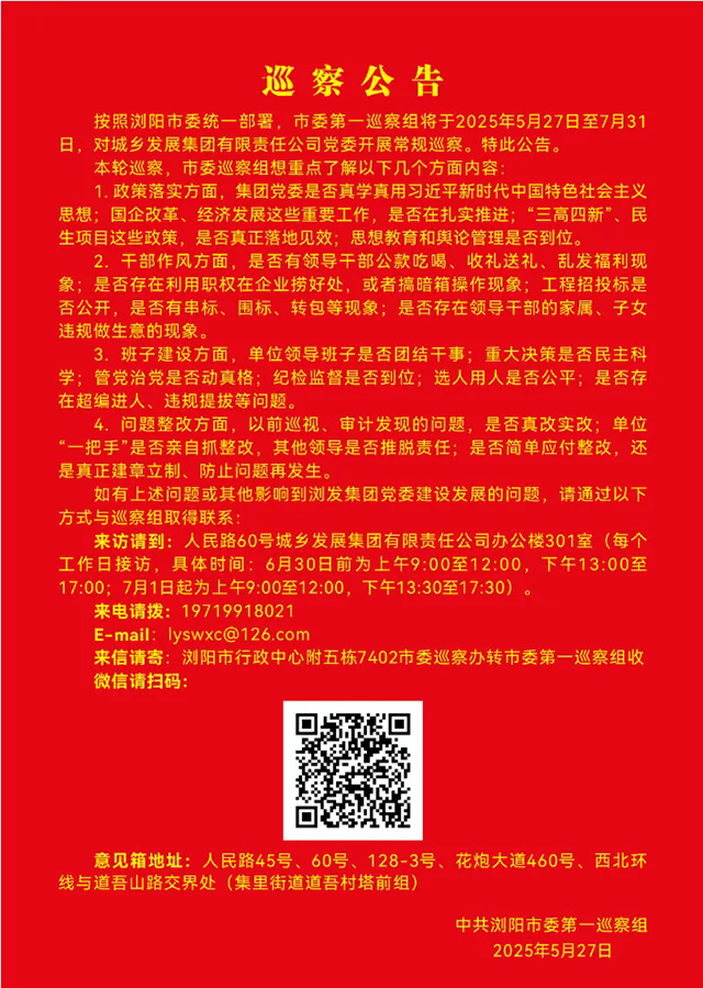 接下來,市委第一巡察組將在瀏發(fā)集團(tuán)開展2個(gè)月左右的巡察。巡察期間(2025年5月27日—2025年7月31日)設(shè)專門聯(lián)系電話:19719918021;接訪地址:人民東路60號(hào)瀏陽市城鄉(xiāng)發(fā)展集團(tuán)有限責(zé)任公司辦公樓301室,同時(shí),在人民路45號(hào)、60號(hào)、128-3號(hào)、花炮大道460號(hào)、西北環(huán)線與道吾山路交界處(集里街道道吾村塔前組)設(shè)置意見箱。工作日接聽電話的時(shí)間為9∶00至12∶00,13∶00至17∶00(7月以后夏令時(shí))。