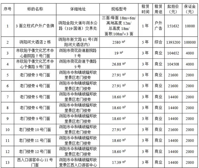 受瀏陽市交通建設投資有限公司和瀏陽市瀏陽河大酒店等單位委托,根據(jù)國有資產(chǎn)管理的相關(guān)規(guī)定,我公司定于2021年4月29日上午10:00在瀏陽市城鄉(xiāng)發(fā)展集團有限責任公司8樓會議室(人民東路60號),對下列標的面向社會進行公開拍租,標的情況見下表: