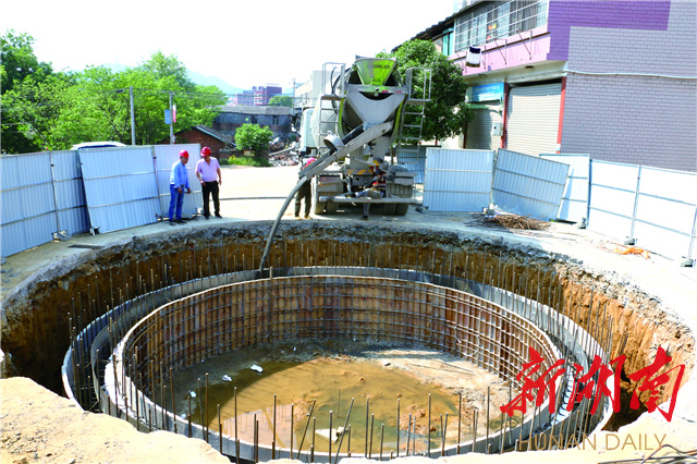 (凈溪河截污干管工程項(xiàng)目正在進(jìn)行污水管網(wǎng)工作井混凝土澆筑。)