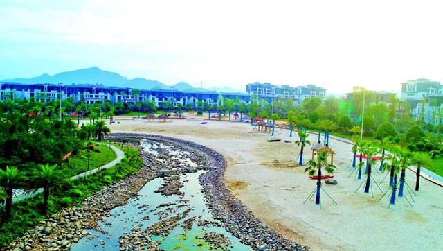 陽光沙灘,細(xì)膩又柔和,沙灘上建有6個休閑亭,周圍一棵棵棕櫚樹隨風(fēng)搖曳,鵝卵石遍布,大大小小、白白凈凈、錯落有致;水石相依,沙石一體,沙灘與風(fēng)光帶形成了一道別致的景觀,令人心曠神怡。