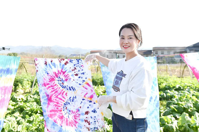 在現(xiàn)場老師的指導(dǎo)下,大家借助線繩、皮筋等工具,將圍巾折疊、纏繞、打結(jié)固定,然后在潔白素凈的圍巾上侵染上自己精心挑選的顏色。