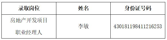 瀏陽(yáng)市恒遠(yuǎn)建設(shè)開(kāi)發(fā)有限公司公開(kāi)招聘房地產(chǎn)開(kāi)發(fā)項(xiàng)目職業(yè)經(jīng)理人資格審查、筆試、面試、體檢、綜合考察工作均已經(jīng)結(jié)束,現(xiàn)將擬錄用人員名單公示如下: