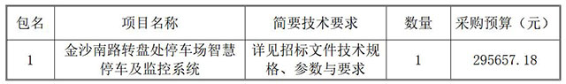 一、采購(gòu)項(xiàng)目名稱:金沙南路轉(zhuǎn)盤處停車場(chǎng)智慧停車及監(jiān)控系統(tǒng)