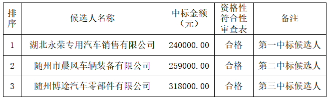受 湖南株樹橋城市運(yùn)營(yíng)服務(wù)有限責(zé)任公司 的委托,本代理機(jī)構(gòu)對(duì) 灑水車、壓縮垃圾收集車采購(gòu)(第三次) 進(jìn)行公開招標(biāo)采購(gòu),現(xiàn)將采購(gòu)結(jié)果公告如下: